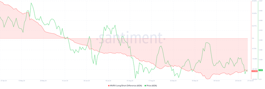 कार्डानो की वर्तमान बाजार भावना एक संभावित चुनौती को दर्शाती है, विशेषकर अल्पकालिक धारकों के बीच। MVRV लॉन्ग/शॉर्ट अंतर, एक मैट्रिक जो बाजार लाभप्रदता को इंगित करता है, दिखाता है कि अल्पकालिक धारक वर्तमान में लाभ में हैं। ये अल्पकालिक धारक आमतौर पर एक महीने से कम समय के लिए संपत्तियों को धारण करते हैं और बाजार में उतार-चढ़ाव के दौरान बेचने की प्रवृत्ति रखते हैं।