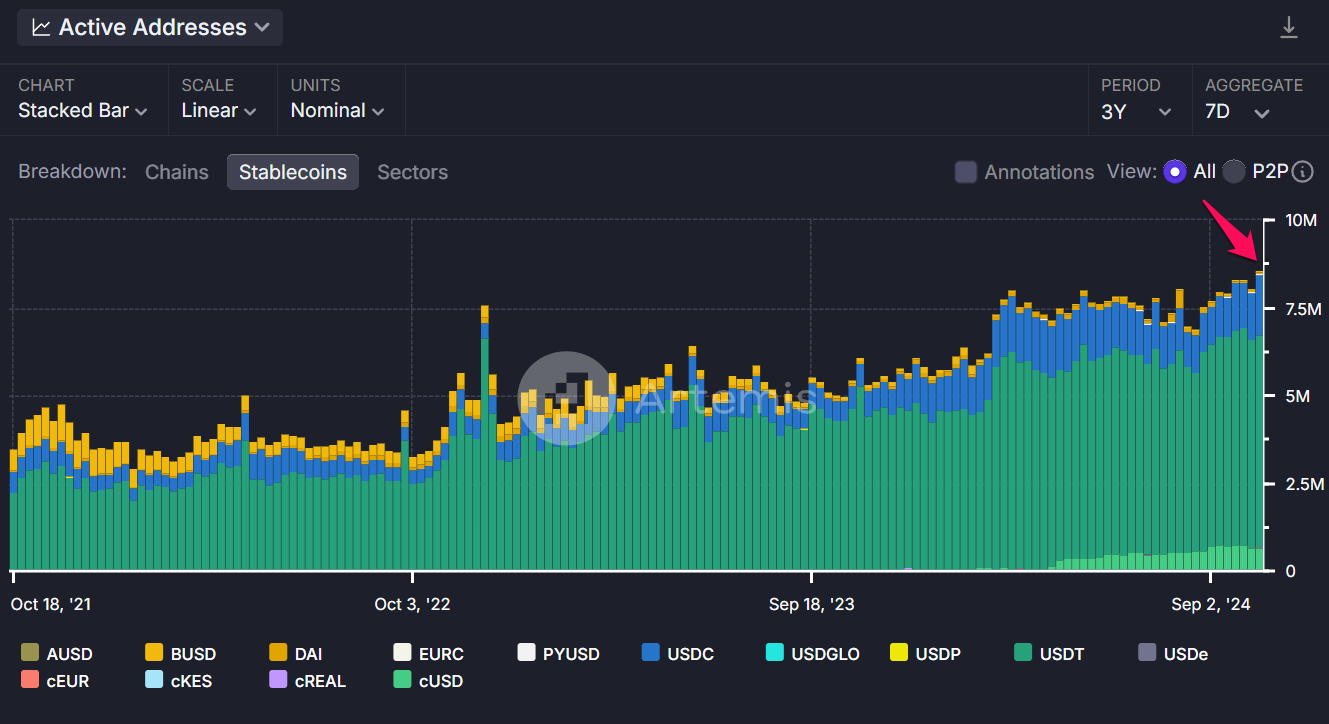 साप्ताहिक सक्रिय स्टेबलकॉइन पते स्टेबलकॉइन ट्रेडिंग में जीवंतता को दर्शाते हैं। यह आंकड़ा सितंबर में प्रति सप्ताह 8 मिलियन से ऊपर लगातार बना रहा, पिछले सप्ताह 8.6 मिलियन पर चरम पर पहुंच गया।