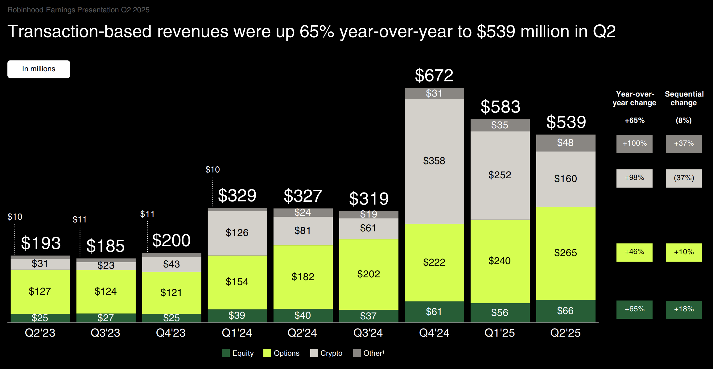 Kraken ने साल-दर-साल (YoY) स्थिर वृद्धि की रिपोर्ट की, लेकिन तिमाही में गिरावट देखी गई। इसके अलावा, Robinhood ने Q1 2025 की तुलना में कमजोर प्रदर्शन का समान रुझान दिखाया।