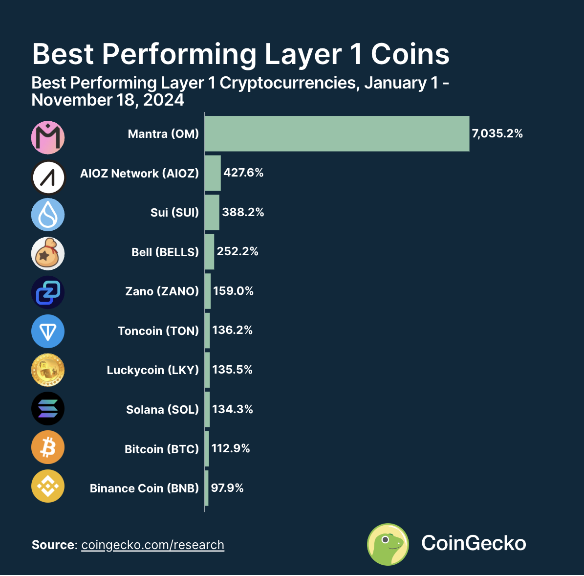 एनालिटिक्स फर्म CoinGecko के डेटा से पता चलता है कि लेयर-1 नेटिव टोकन 2024 में 7,000% बढ़े। जबकि Bitcoin और Ethereum जैसे प्रमुख प्रोजेक्ट्स ने महत्वपूर्ण लाभ दर्ज किए, अन्य टोकन ने विशेष बाजारों में उल्लेखनीय वृद्धि देखी।
