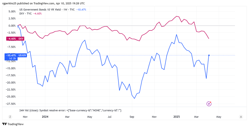 U.S. 10-वर्षीय ट्रेजरी यील्ड्स में अचानक वृद्धि हुई, और DXY (यू.एस. डॉलर इंडेक्स) में तेज गिरावट आई। ये दोनों घटनाएँ एक साथ घटित होने के लिए अत्यधिक असामान्य हैं। सामान्यतः, संकट के समय ट्रेजरी और डॉलर मजबूत होते हैं। इस बार, दोनों ही कमजोर पड़े।