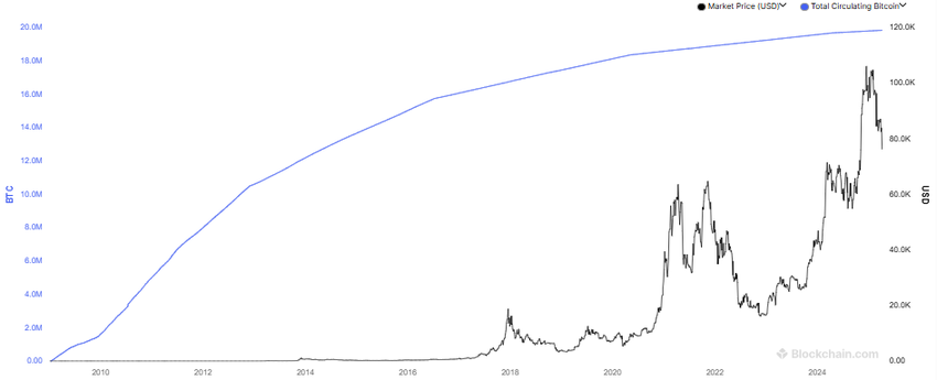 निम्नलिखित चार्ट में बिटकॉइन की सर्कुलेशन में मौजूद संख्या को इसके मूल्य के साथ दिखाया गया है।