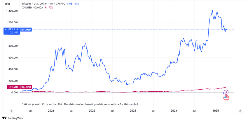 सोने की कीमत सामान्यतः अपेक्षाकृत सपाट रहती है, समय के साथ हल्की वृद्धि होती है और निचला जोखिम सीमित होता है। बिटकॉइन अभी भी अस्थिर है और एक समय पर यह अपने सर्वकालिक उच्च से लगभग 80% गिर गया था।