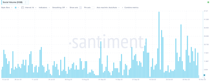- डीजीबी के लिए ट्रेडिंग वॉल्यूम तब से गिर गया है। 17 दिसंबर, 2022 तक यह $44.58 मिलियन है। यह काउंटर पर सकारात्मक भावनाओं के निर्माण का संकेत देता है।
