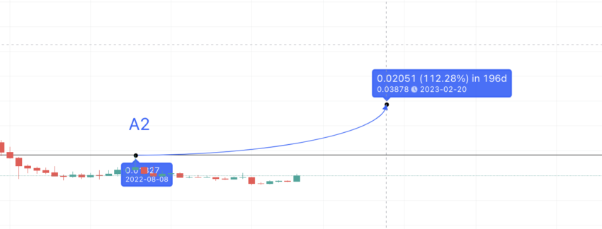 अगला उच्च लगभग $0.038 पर आता है, जो 17 फरवरी, 2023 के करीब है।