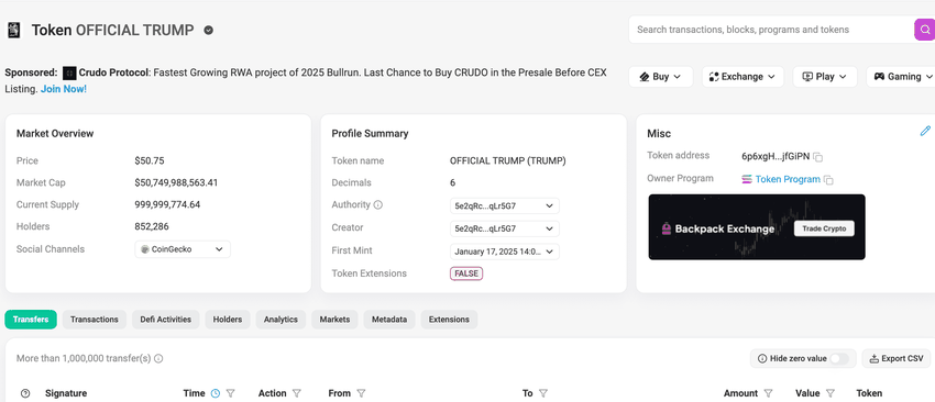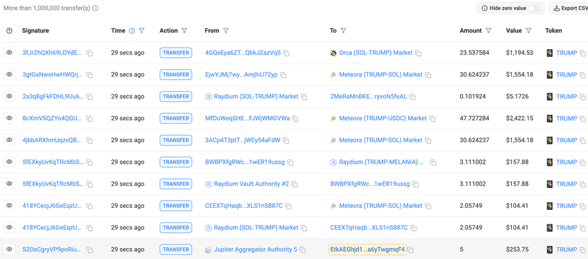 नोट: 21 जनवरी 2025 तक $TRUMP Coin की कीमतों में गिरावट आई है, और मूल्य में सुधार के लिए ट्रेडिंग वॉल्यूम में वृद्धि आवश्यक है।