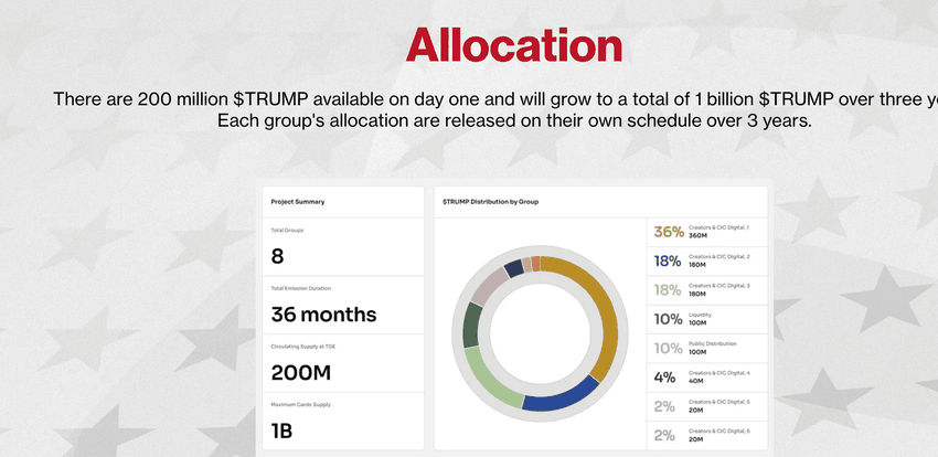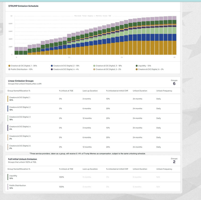 ➤ $TRUMP Coin में पारदर्शी वेस्टिंग शेड्यूल और तीन साल तक के लिए डेली टोकन अनलॉक्स शामिल हैं, जिससे यह मार्केट स्थिरता और ग्रोथ के बीच संतुलन बनाने की कोशिश करता है।