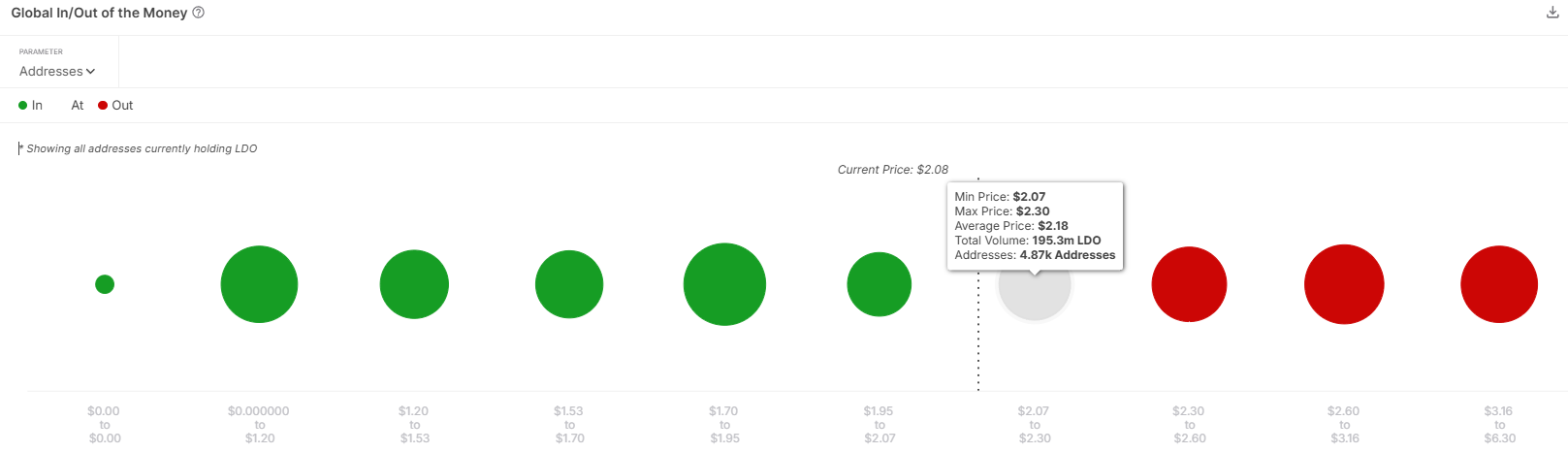 ग्लोबल In/Out of the Money (GIOM) मेट्रिक दिखाता है कि लगभग 200 मिलियन LDO टोकन, जिनकी कीमत $403 मिलियन से अधिक है, प्रॉफिटेबिलिटी की प्रतीक्षा कर रहे हैं। यह सप्लाई तब अधिग्रहित की गई थी जब LDO $2.07 और $2.30 के बीच ट्रेड कर रहा था, जिससे $2.30 से ऊपर की वृद्धि इन होल्डर्स के लिए महत्वपूर्ण हो जाती है। जब तक यह स्तर पार नहीं होता, तब तक इस सप्लाई का अधिकांश हिस्सा अनप्रॉफिटेबल रहता है।
