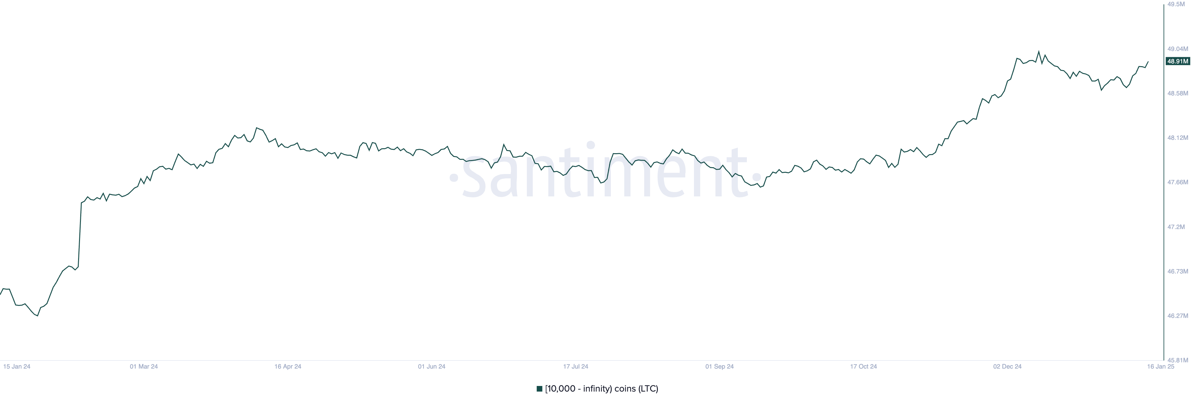 Santiment के अनुसार, 9 जनवरी से, Litecoin के बड़े निवेशकों, जिनके पास 10,000 से अधिक LTC हैं, ने वर्तमान मार्केट कीमतों पर $30 मिलियन मूल्य के 250,000 कॉइन्स खरीदे हैं। इससे इस समूह की कुल होल्डिंग्स 49 मिलियन LTC हो गई है, जो पिछले 30 दिनों में सबसे अधिक है।