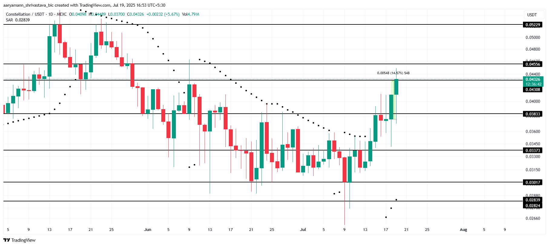 $0.043 पर ट्रेडिंग करते हुए, DAG की प्रभावशाली रैली मजबूत मार्केट सेंटिमेंट द्वारा संचालित अपवर्ड मोमेंटम का संकेत देती है। अगर बुलिश ट्रेंड बरकरार रहता है, तो टोकन की वृद्धि और तेज हो सकती है।