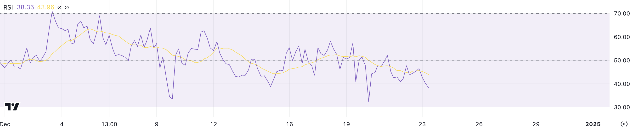 Relative Strength Index (RSI) OM के लिए 38.3 पर एक अपेक्षाकृत न्यूट्रल स्थिति बनाए हुए है, जो 3 दिसंबर से न्यूनतम वोलैटिलिटी दिखा रहा है। RSI एक मोमेंटम ऑसिलेटर है जो 0 से 100 तक होता है, जिसमें 30 से नीचे की रीडिंग ओवरसोल्ड कंडीशंस को दर्शाती है और 70 से ऊपर की रीडिंग ओवरबॉट लेवल्स को सुझाती है।