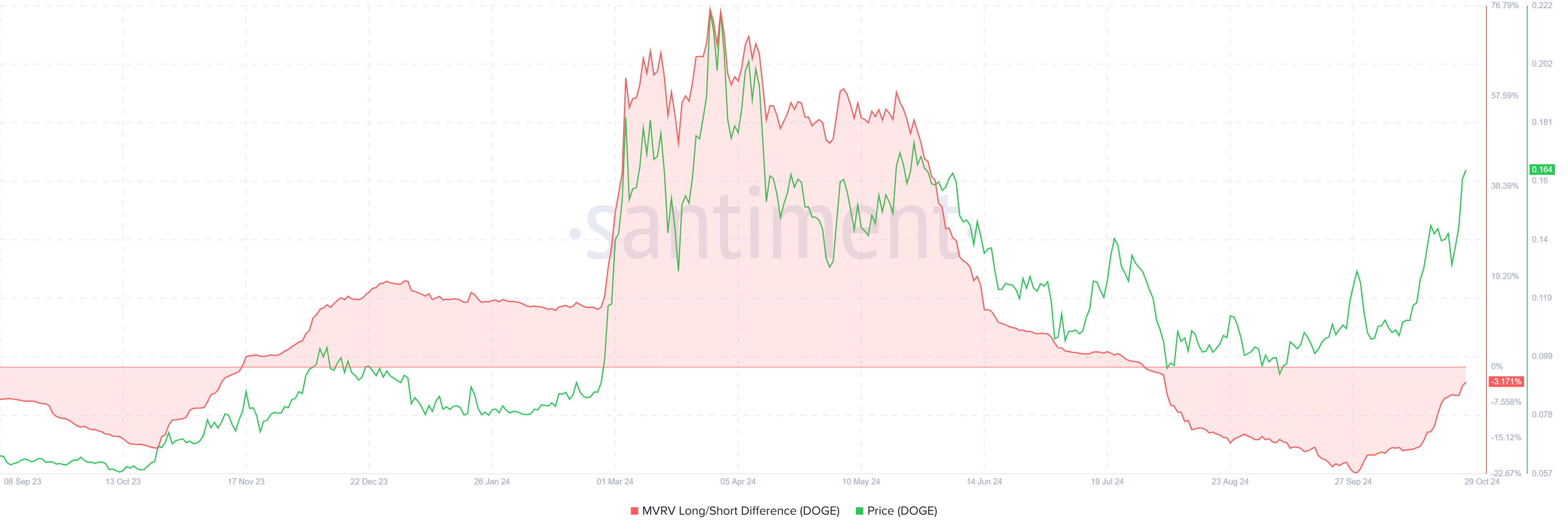 Dogecoin की बाजार भावना वर्तमान में स्थिरता को दर्शाती है, जैसा कि MVRV Long/Short Difference मेट्रिक द्वारा संकेतित है। यह संकेतक दिखाता है कि लंबी और छोटी अवधि के धारक लाभ या हानि के मामले में समान स्तर पर हैं, जिससे पता चलता है कि संपत्ति किसी भी समूह की ओर अत्यधिक पक्षपाती नहीं है।
