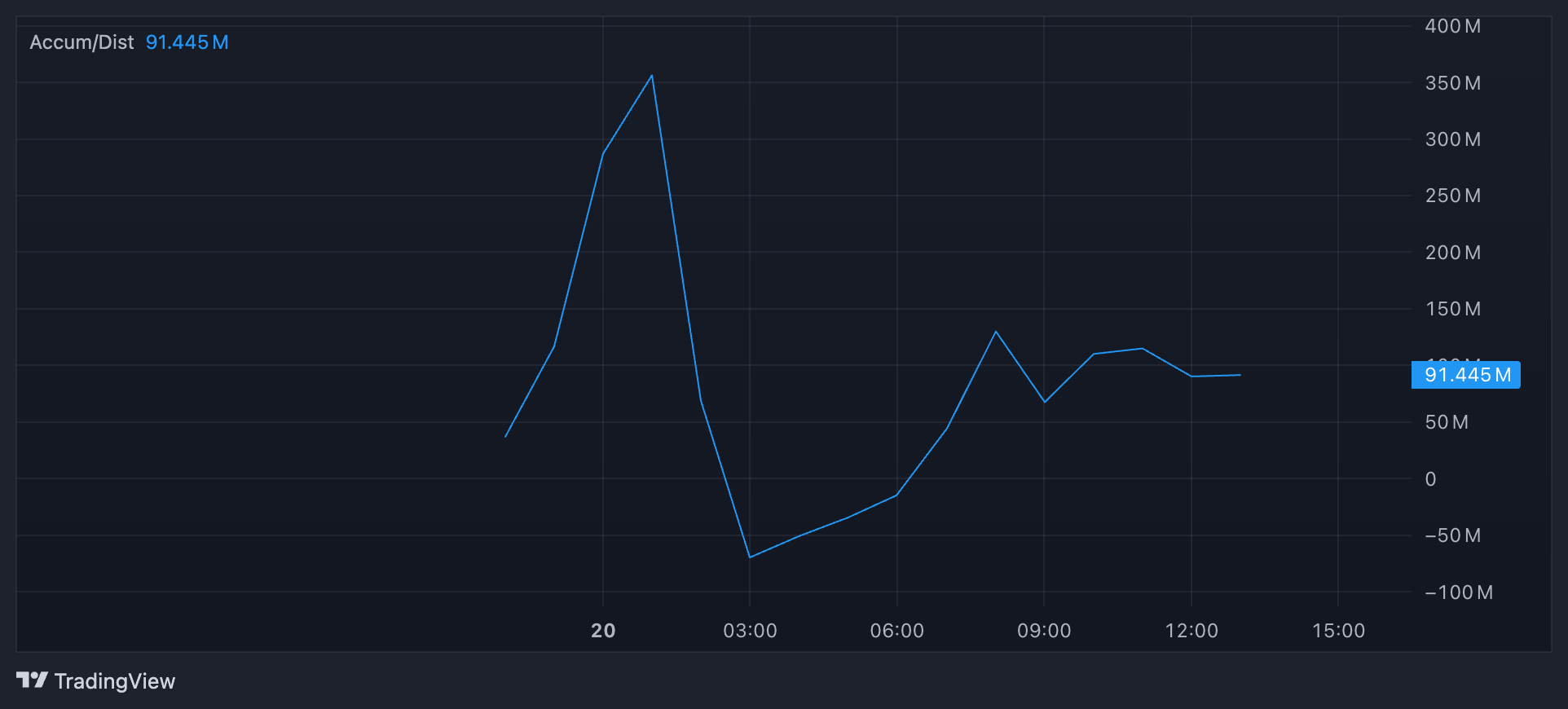 इस लेखन के समय, MELANIA $10.10 पर ट्रेड कर रहा है, और इसके आवर्स चार्ट से पता चलता है कि मीम कॉइन की मांग बढ़ रही है। उदाहरण के लिए, वैल्यू में थोड़ी गिरावट के बाद, MELANIA की Accumulation and Distribution (A/D) लाइन अब 91.445 मिलियन पर अपवर्ड ट्रेंड में है।