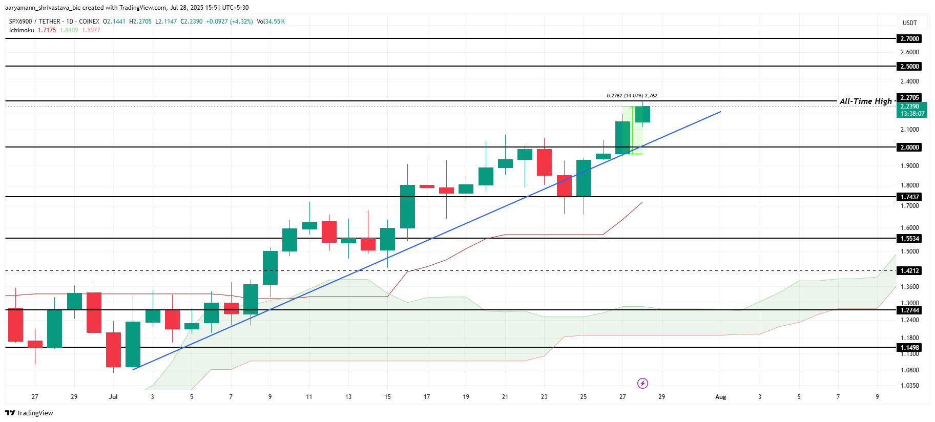 वर्तमान में $2.23 पर ट्रेड कर रहा SPX पिछले 24 घंटों में 14% बढ़ा है। Ichimoku Cloud, जो सपोर्ट के रूप में कार्य कर रहा है, बुलिश मोमेंटम का संकेत देता है। यह सुझाव देता है कि SPX और बढ़ सकता है, $2.50 या उससे अधिक तक पहुंचने की संभावना है यदि मार्केट की स्थिति अनुकूल रहती है और निवेशक का विश्वास बना रहता है।