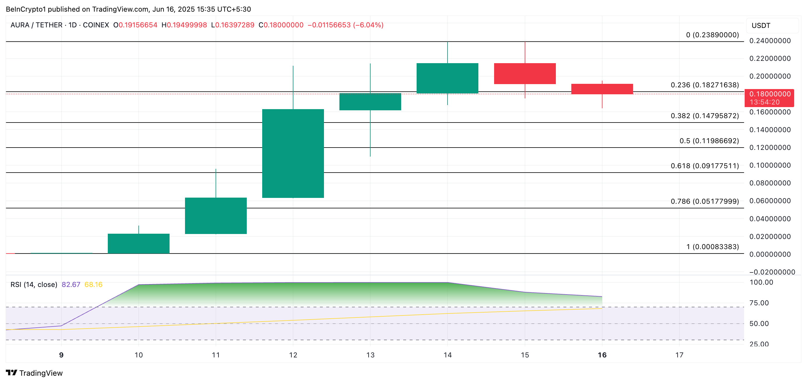कल, इस altcoin ने $0.23 का ऑल-टाइम हाई रिकॉर्ड किया, जिससे यह 25% गिर चुका है। प्रेस समय पर, AURA $0.18 पर ट्रेड कर रहा है।