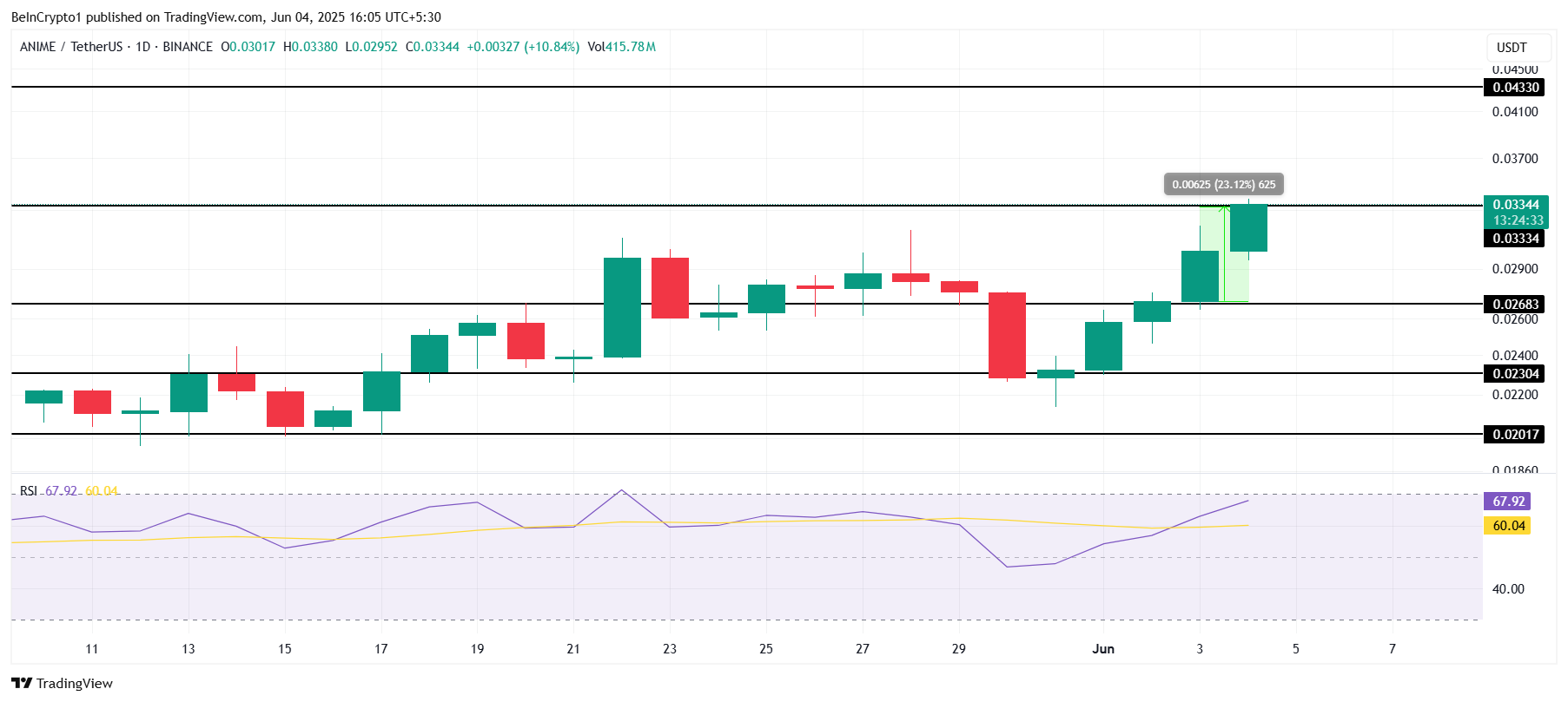 हालांकि, अगर निवेशक बेचने के बजाय होल्ड करने का निर्णय लेते हैं, और व्यापक बाजार की स्थिति इस निर्णय का समर्थन करती है, तो ANIME $0.033 बाधा को पार कर सकता है। इस प्रतिरोध को सफलतापूर्वक पार करने से ANIME के $0.043 की ओर बढ़ने का रास्ता खुल जाएगा, बियरिश दृष्टिकोण को नकारते हुए और आगे के लाभ को ट्रिगर करेगा।