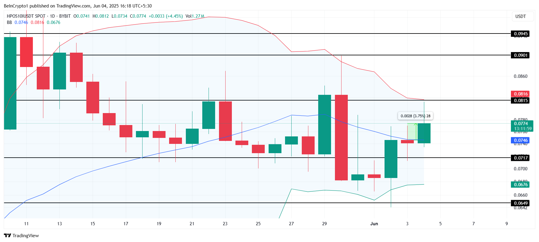 बोलिंजर बैंड्स वर्तमान में सख्त हो रहे हैं, जो संकेत देते हैं कि BITCOIN के लिए महत्वपूर्ण अस्थिरता आ सकती है। यदि व्यापक बाजार की स्थितियाँ बुलिश रहती हैं, तो मीम कॉइन स्थिर हो सकता है और $0.081 सपोर्ट स्तर को सुरक्षित कर सकता है, जिससे संभावित आगे के लाभ के लिए मंच तैयार हो सकता है। सख्त होते बैंड्स प्राइस मूवमेंट को किसी भी दिशा में इंगित करते हैं।