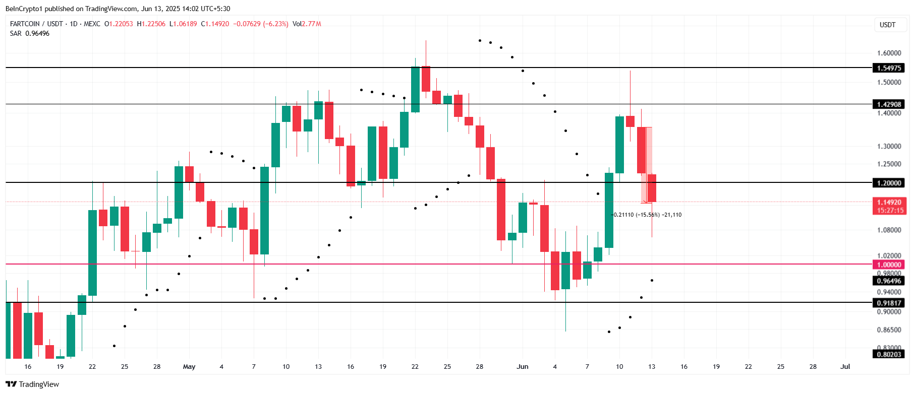 FARTCOIN की कीमत पिछले 24 घंटों में 15.5% गिर गई है, और यह $1.14 पर ट्रेड कर रही है। मीम कॉइन $1.20 के सपोर्ट लेवल को फिर से हासिल करने के लिए संघर्ष कर रहा है। हाल की गिरावटों के बावजूद, इसमें अभी भी उछाल की संभावना है यदि यह मौजूदा मार्केट अस्थिरता के बीच इस महत्वपूर्ण प्राइस पॉइंट के ऊपर स्थिर हो सकता है।
