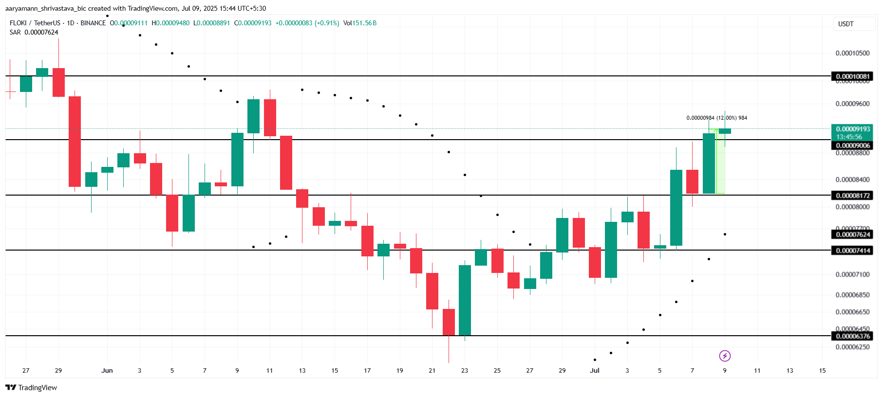 FLOKI पिछले 24 घंटों में 12% बढ़कर $0.00009193 के लगभग मासिक उच्च स्तर पर पहुंच गया है। मीम कॉइन $0.00010081 के प्रमुख प्रतिरोध स्तर को पार करने के कगार पर है। यदि अपवर्ड मोमेंटम जारी रहता है, तो FLOKI निकट भविष्य में और मूल्य वृद्धि देख सकता है।