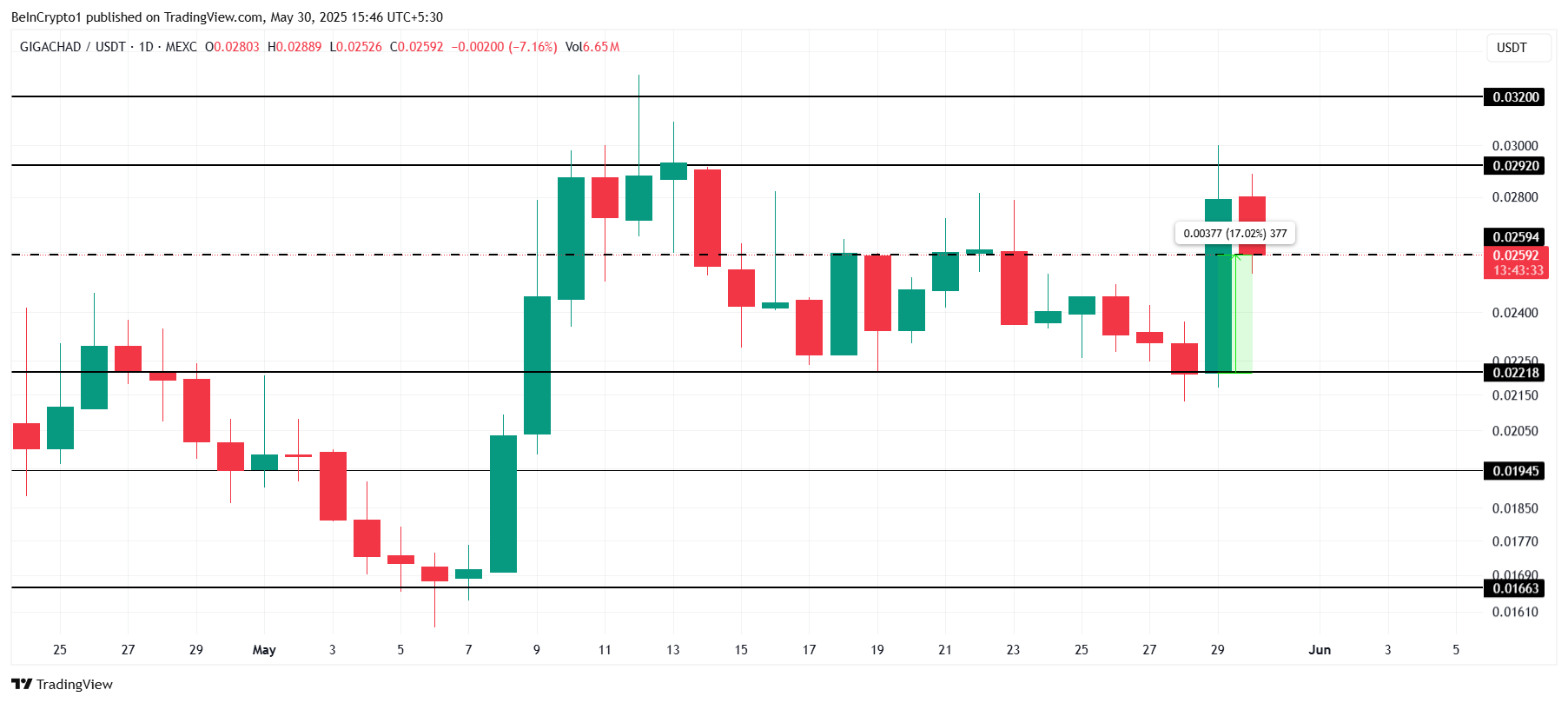 GIGA एक शीर्ष प्रदर्शन करने वाला मीम कॉइन के रूप में उभरा है, जो पिछले 24 घंटों में 17% बढ़ा है। वर्तमान में $0.0259 पर ट्रेड कर रहा है, यह बढ़ी हुई मार्केट गतिविधि के बीच इस लोकल सपोर्ट को सुरक्षित करने की कोशिश कर रहा है।