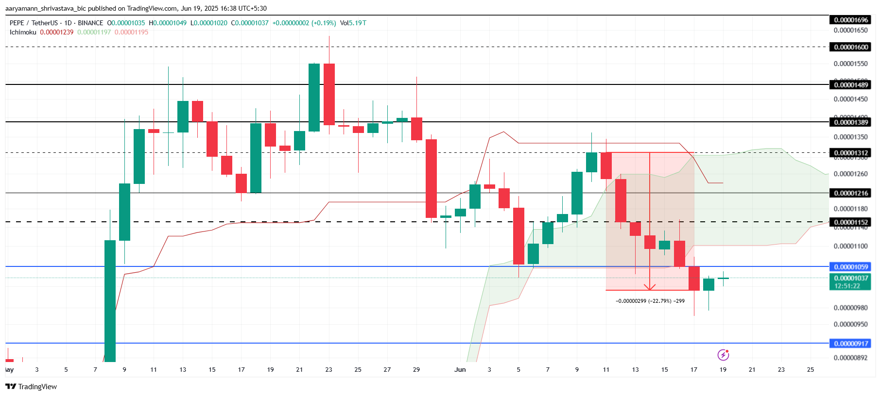 Ichimoku Cloud इंडिकेटर सुझाव देता है कि PEPE का बुलिश मोमेंटम मजबूत बना हुआ है। यह तकनीकी विश्लेषण संभावित उछाल की ओर इशारा करता है, जिसमें altcoin $0.00001152 तक बढ़ सकता है। यदि PEPE $0.00001059 के रेजिस्टेंस को पार कर सकता है, तो यह अपवर्ड मोमेंटम को पुनः प्राप्त कर सकता है और अधिक निवेशक रुचि आकर्षित कर सकता है।