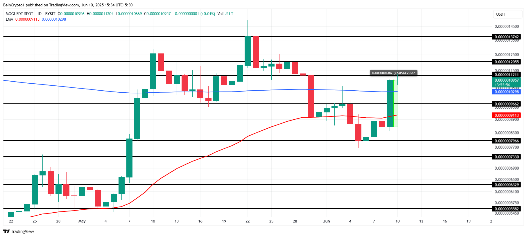 MOG शीर्ष प्रदर्शन करने वाले मीम कॉइन के रूप में उभरा है, पिछले 24 घंटों में 27% की वृद्धि दर्ज की है। वर्तमान में $0.000001095 पर ट्रेड कर रहा है, यह कॉइन $0.000001121 के महत्वपूर्ण रेजिस्टेंस लेवल के करीब है। इस बाधा को सफलतापूर्वक पार करने से altcoin के लिए और अधिक प्राइस गेन हो सकते हैं।