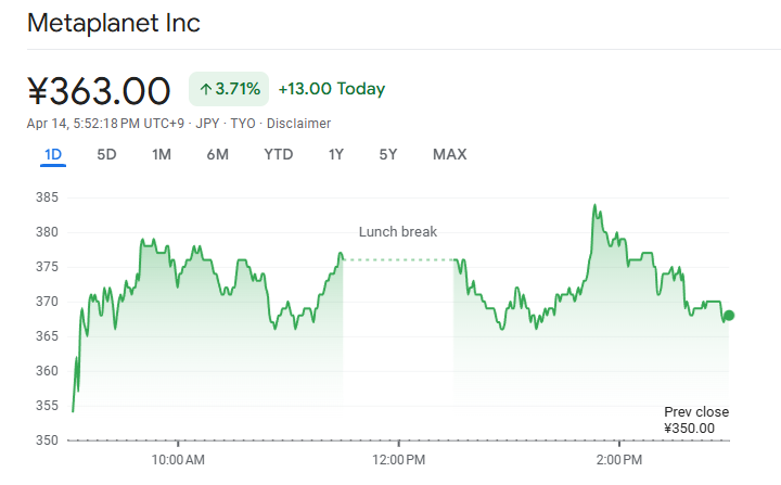 “Metaplanet ने ~$82,549 प्रति बिटकॉइन पर ~$26.3 मिलियन में 319 BTC का अधिग्रहण किया है और 2025 YTD में BTC यील्ड 108.3% प्राप्त की है। 4/14/2025 तक, हमने ~$85,366 प्रति बिटकॉइन पर ~$386.3 मिलियन में 4525 BTC का अधिग्रहण किया है,” Gerovich ने दावा किया।