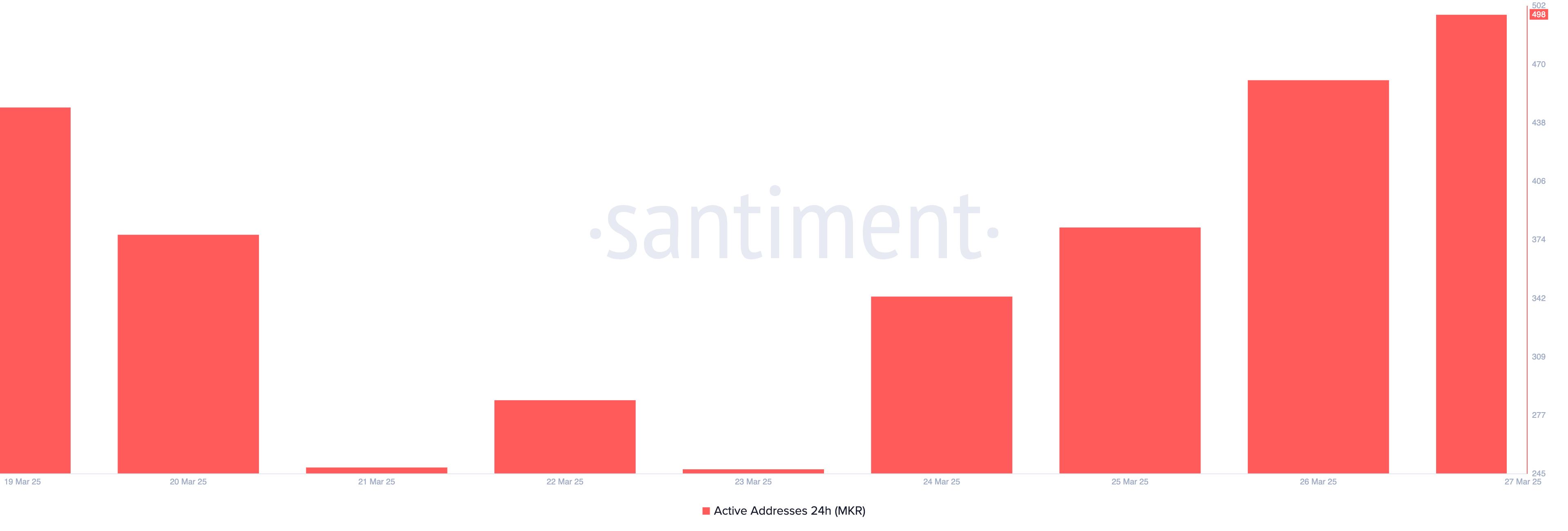 Santiment के अनुसार, MKR के सक्रिय एड्रेस काउंट में 498 का सात-दिन का उच्च स्तर दर्ज किया गया है, जो पिछले 24 घंटों में 8% की वृद्धि को दर्शाता है। किसी एसेट के दैनिक सक्रिय एड्रेस काउंट में वृद्धि का मतलब है कि अधिक मार्केट प्रतिभागी लेन-देन में शामिल हो रहे हैं, जिससे मांग बढ़ रही है।