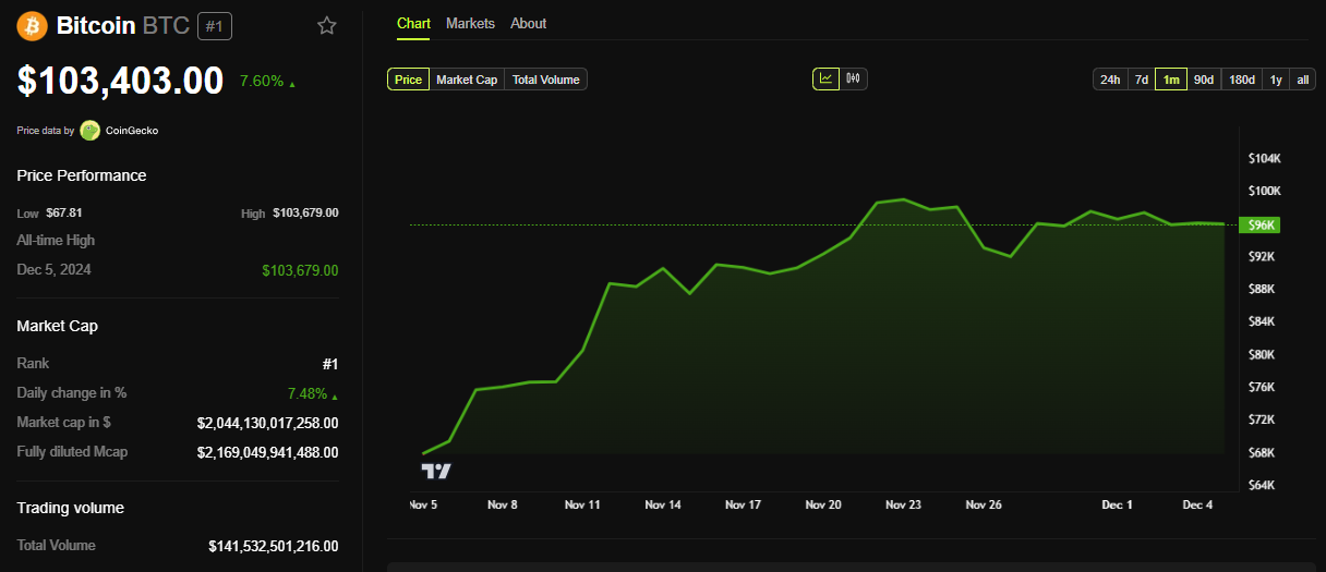 इन सभी घटनाक्रमों को मिलाकर, यह संकेत मिलता है कि वित्तीय संस्थान और सरकारी निकाय डिजिटल संपत्तियों की क्षमता और राष्ट्रीय अर्थव्यवस्था को बदलने में उनकी महत्वपूर्णता को समझ रहे हैं। BeInCrypto के डेटा के अनुसार, BTC इस लेखन के समय $103,403 पर ट्रेड कर रहा है, जो गुरुवार के सत्र के खुलने के बाद से 7.6% की वृद्धि का प्रतिनिधित्व करता है।