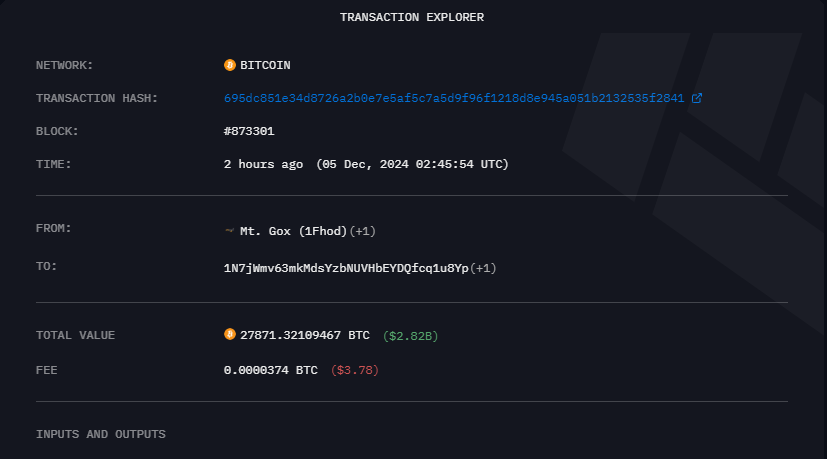 ताज़ा अपडेट के अनुसार, Mt. Gox ने बुधवार रात को 24,052 BTC जिसकी कीमत $2.43 बिलियन है, को एक नए वॉलेट में ट्रांसफर किया। यह लेन-देन तब हुआ जब Bitcoin ने पहली बार $100,000 को पार किया।