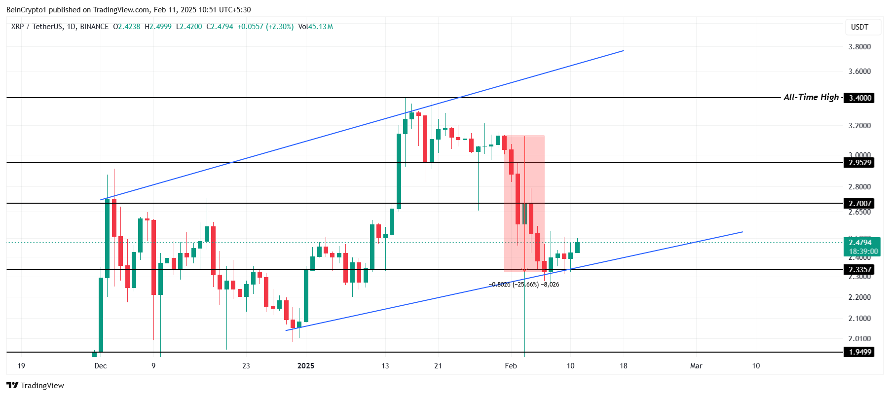 हालांकि, अगर bearish मार्केट कंडीशंस बनी रहती हैं, तो XRP वापस $2.33 सपोर्ट लेवल पर गिर सकता है। इस सपोर्ट का नुकसान बुलिश दृष्टिकोण को अमान्य कर देगा, जिससे प्राइस और नीचे जा सकती है। यह स्थिति निवेशक भावना को कमजोर कर सकती है और किसी भी संभावित रिकवरी में देरी कर सकती है।