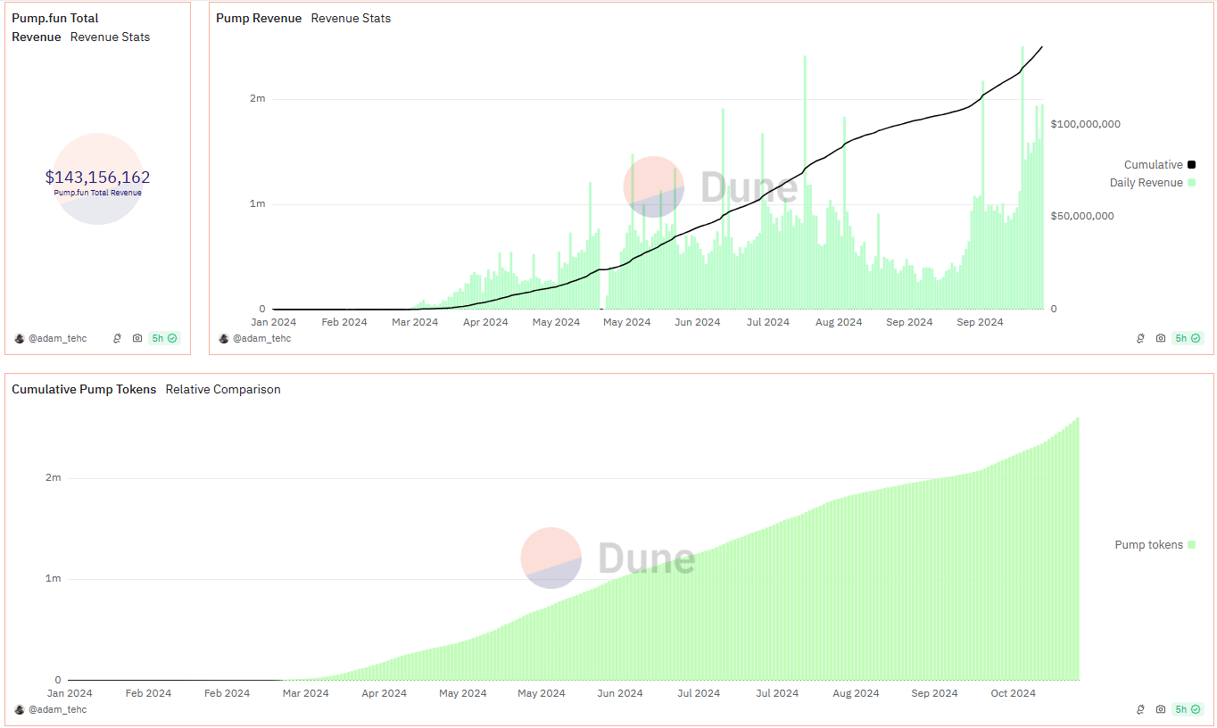 अक्टूबर में, Pump.fun की आय में तेजी आई, प्रतिदिन औसतन $1.6 मिलियन पहुँच गई, जिससे कुल आय अब $143 मिलियन से अधिक हो गई है। प्लेटफॉर्म की वित्तीय सफलता वर्तमान मेम कॉइन्स के प्रति बाजार की आकर्षण को टैप करने से आई है।
