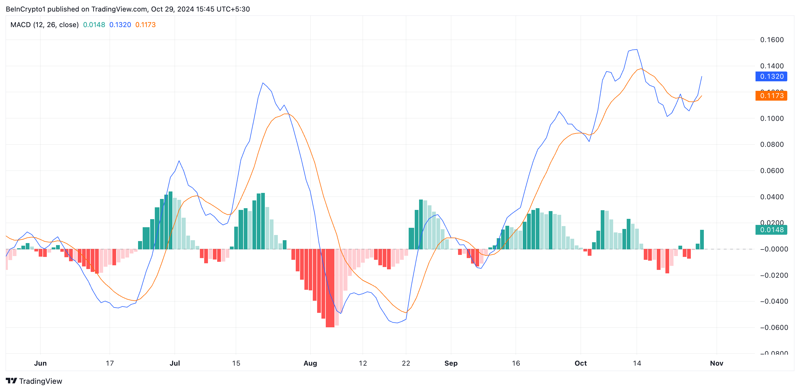 BeInCrypto का मूल्यांकन POPCAT/USD एक-दिन के चार्ट की पुष्टि करता है कि एक विस्तारित रैली की संभावना है। मीम कॉइन के मूविंग एवरेज कन्वर्जेंस/डाइवर्जेंस (MACD), जो एक एसेट के मूल्य रुझानों को मापता है और इसके संभावित खरीद या बिक्री संकेतों की पहचान करता है, इस बुलिश दृष्टिकोण की पुष्टि करता है।