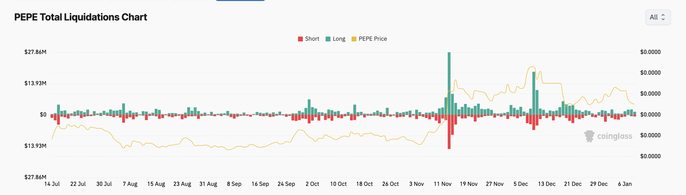 कीमत गिरावट ने फ्यूचर्स मार्केट में PEPE लॉन्ग लिक्विडेशन की लहर को जन्म दिया है, जो Coinglass डेटा के अनुसार 6 जनवरी से $7.73 मिलियन तक पहुंच गई है।
