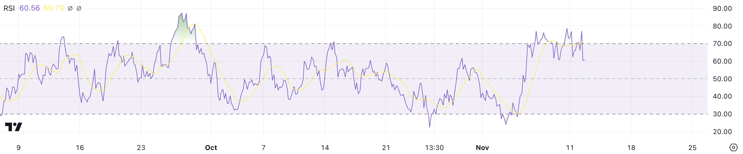 PEPE का Relative Strength Index (RSI) वर्तमान में 60.56 पर है, जो कुछ दिन पहले लगभग 80 था। इस कमी का संकेत है कि खरीदने का दबाव ओवरबॉट स्थितियों को पहुँचने के बाद काफी कम हो गया है।