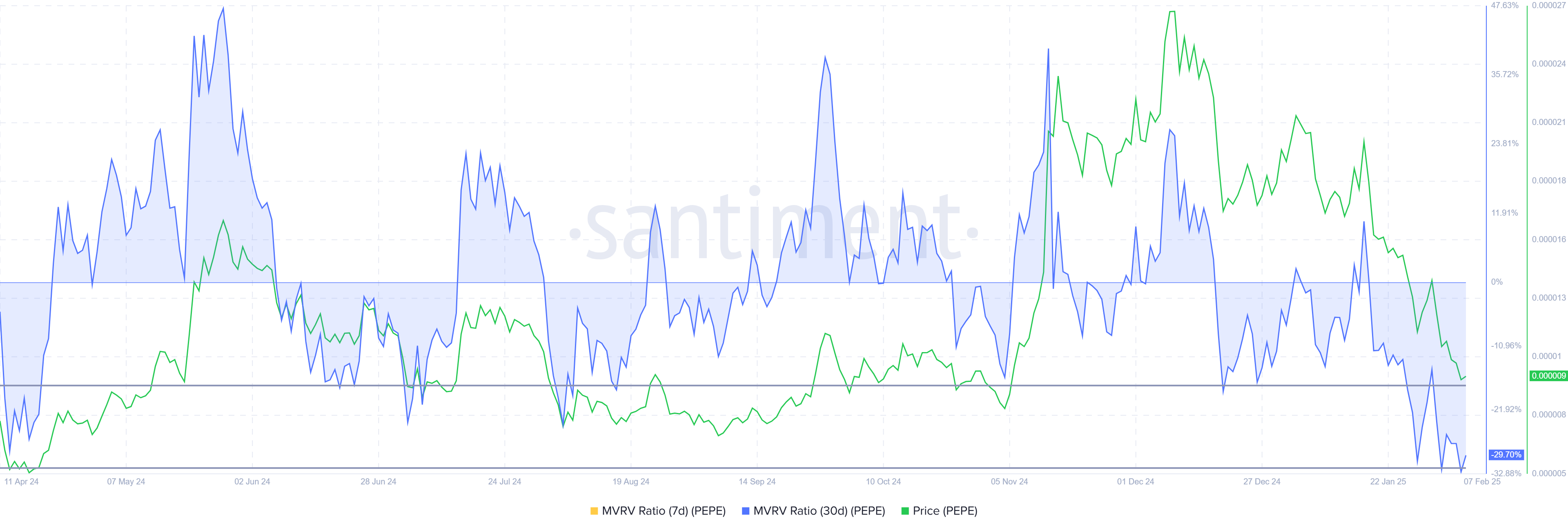 Bears संकेतों के बावजूद, PEPE का मार्केट वैल्यू टू रियलाइज्ड वैल्यू (MVRV) रेशियो मोमेंटम में संभावित बदलाव का सुझाव देता है। MVRV रेशियो -29% तक पहुंच गया है, PEPE को “Opportunity Zone” में रखता है।