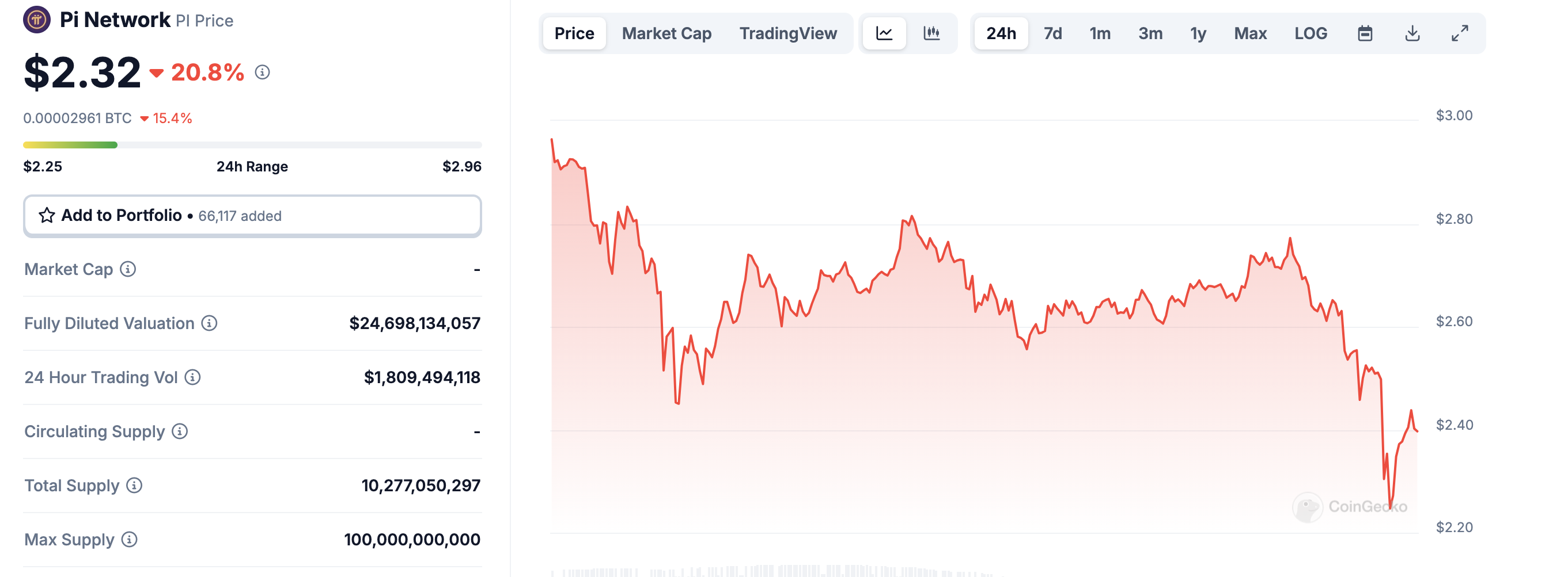 Pi Coin की संभावित Binance लिस्टिंग को लेकर उत्साह इसके हाल के प्रदर्शन के विपरीत है। पिछले दिन में, इसकी कीमत में 20.8% की तेज गिरावट देखी गई, और नवीनतम डेटा के अनुसार यह $2.3 पर ट्रेड कर रहा है।