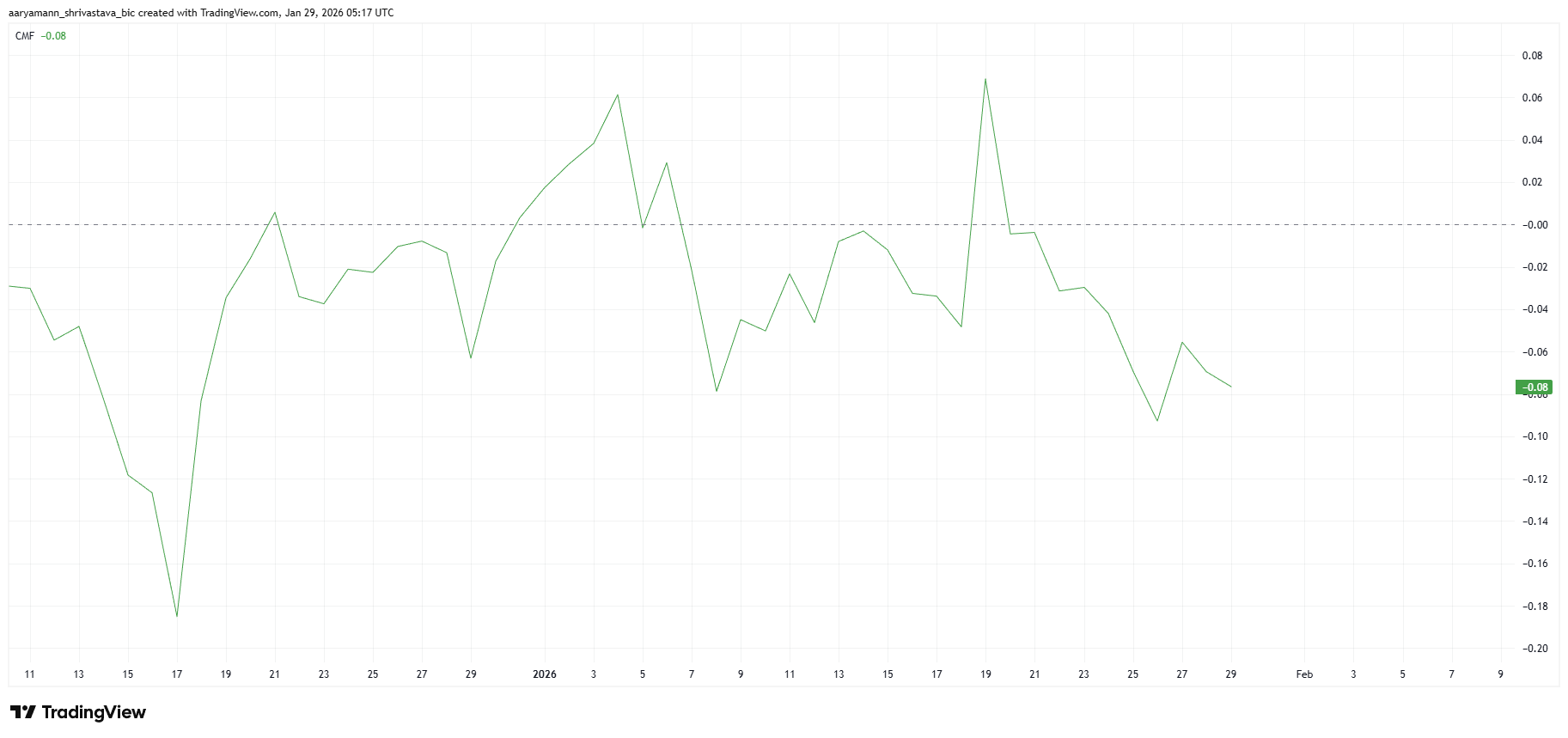 Pi Coin होल्डर्स ने बीते कुछ दिनों में विदड्रॉल्स बढ़ा दिए हैं, जिससे कैपिटल फ्लाइट का संकेत मिलता है। Chaikin Money Flow इंडिकेटर जीरो लाइन के नीचे चला गया है और पिछले छह हफ्तों के सबसे निचले स्तर पर पहुंच गया है। यह बदलाव दर्शाता है कि नेटवर्क में फिलहाल ऑउटफ्लो, इनफ्लो से ज्यादा है।