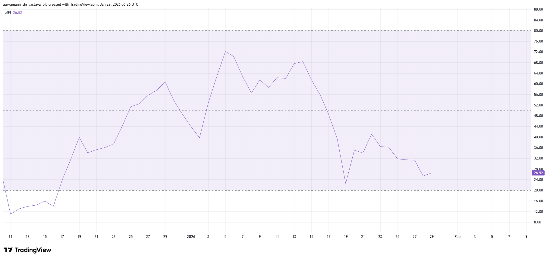 सेलिंग प्रेशर Pi Coin के मार्केट स्ट्रक्चर पर पूरी तरह हावी है। Money Flow Index निगेटिव ज़ोन में है, जो दिखाता है कि वॉल्यूम-वेटेड सेलिंग, बाइंग एक्टिविटी से ज्यादा है। ऐसी कंडीशन में लगातार रिबाउंड होने की संभावना कम है।
