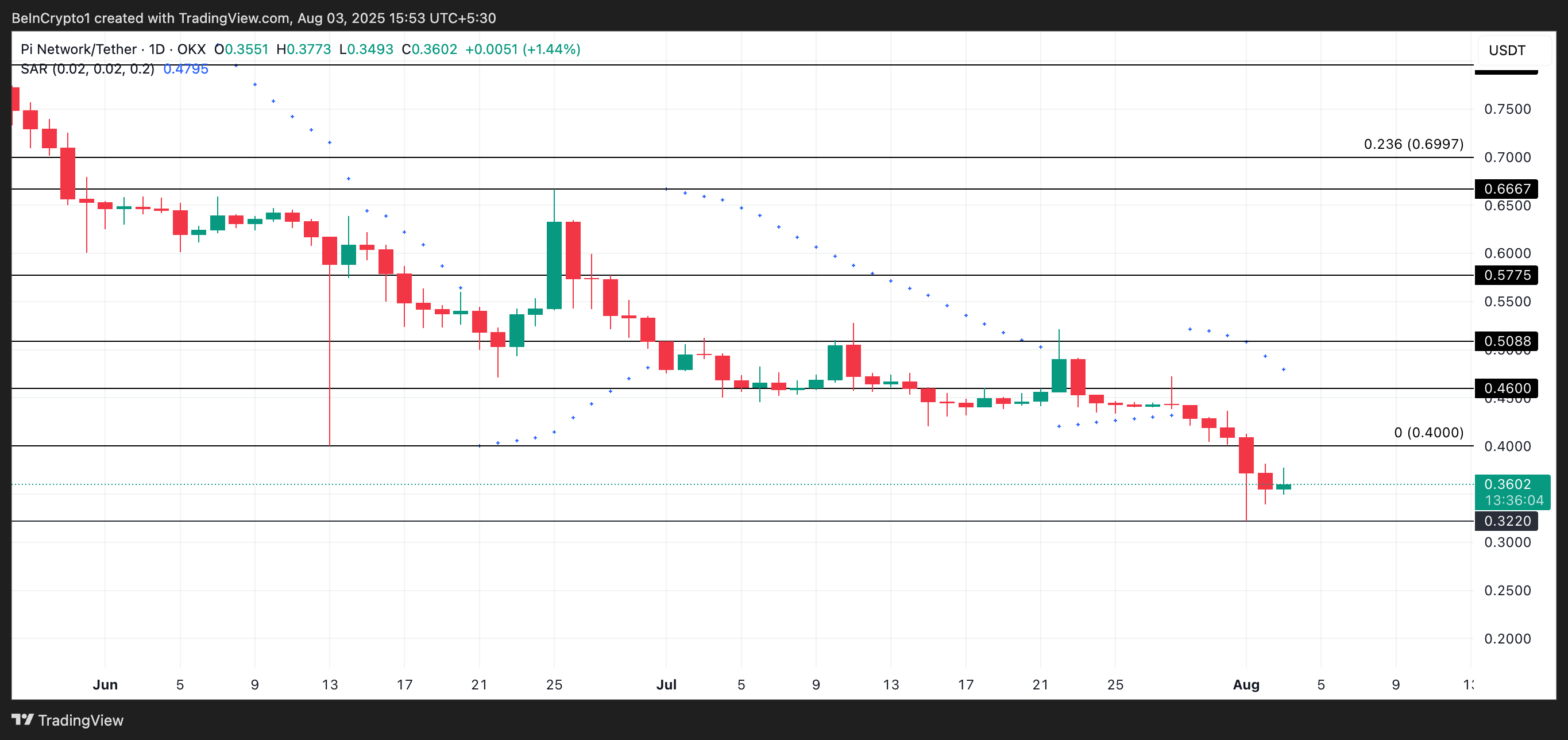 दूसरी ओर, जब कीमत इन डॉट्स के नीचे होती है, तो यह संकेत देता है कि मार्केट डाउनट्रेंड में है। यह बियरिश मोमेंटम और आगे PI कीमत में गिरावट की संभावना का सुझाव देता है जब तक कि कोई बुलिश रिवर्सल नहीं होता।