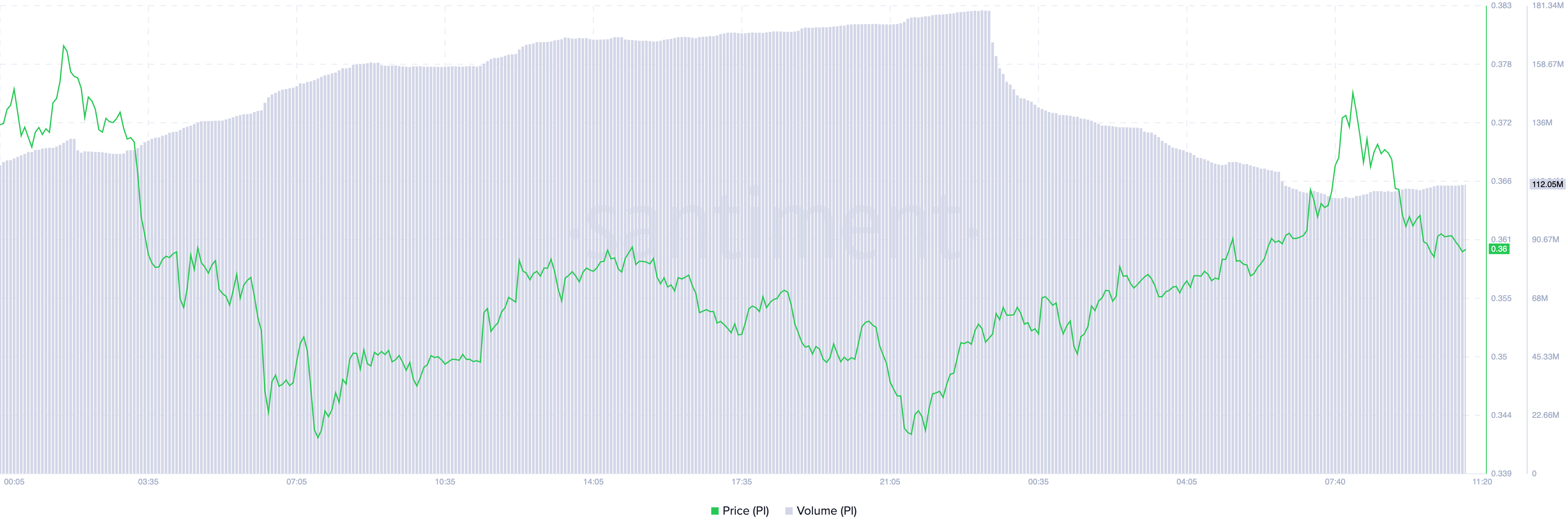 पहले, पिछले 24 घंटों में PI की ट्रेडिंग वॉल्यूम में गिरावट जबकि इसकी कीमत बढ़ रही है, चिंता का कारण है। पिछले दिन में, PI की ट्रेडिंग वॉल्यूम लगभग 30% गिरकर वर्तमान में लगभग $112 मिलियन पर है।