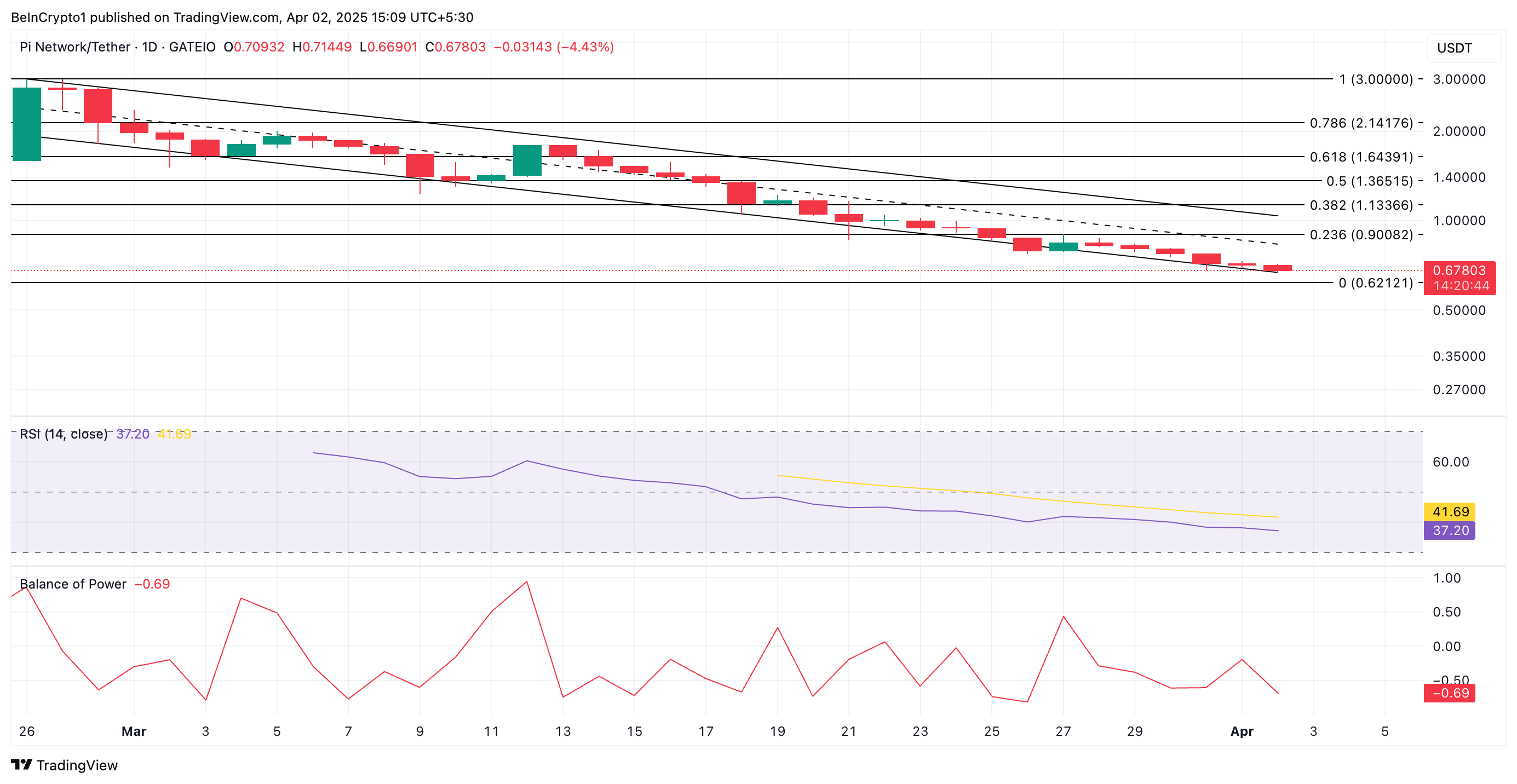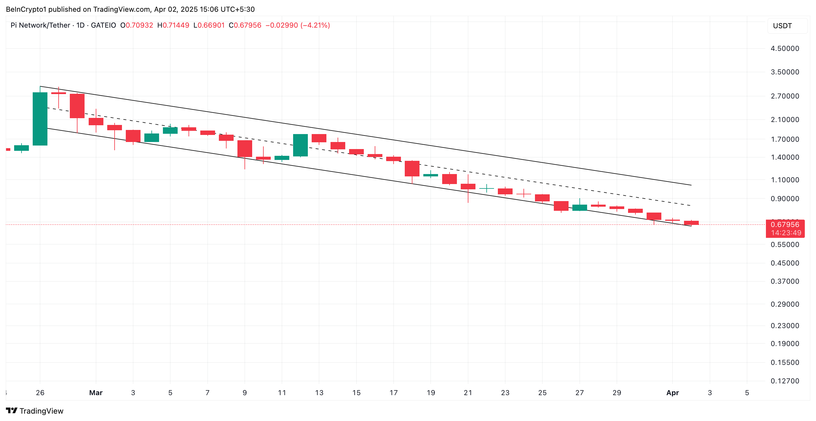 PI ने 26 फरवरी को $3 के ऑल-टाइम हाई पर पहुंचने के बाद से एक घटते समानांतर चैनल के भीतर ट्रेंड किया है, जो इसकी कीमत में गिरावट को दर्शाता है। वर्तमान में $0.67 पर खड़ा है, इस altcoin का मूल्य तब से 78% गिर चुका है।