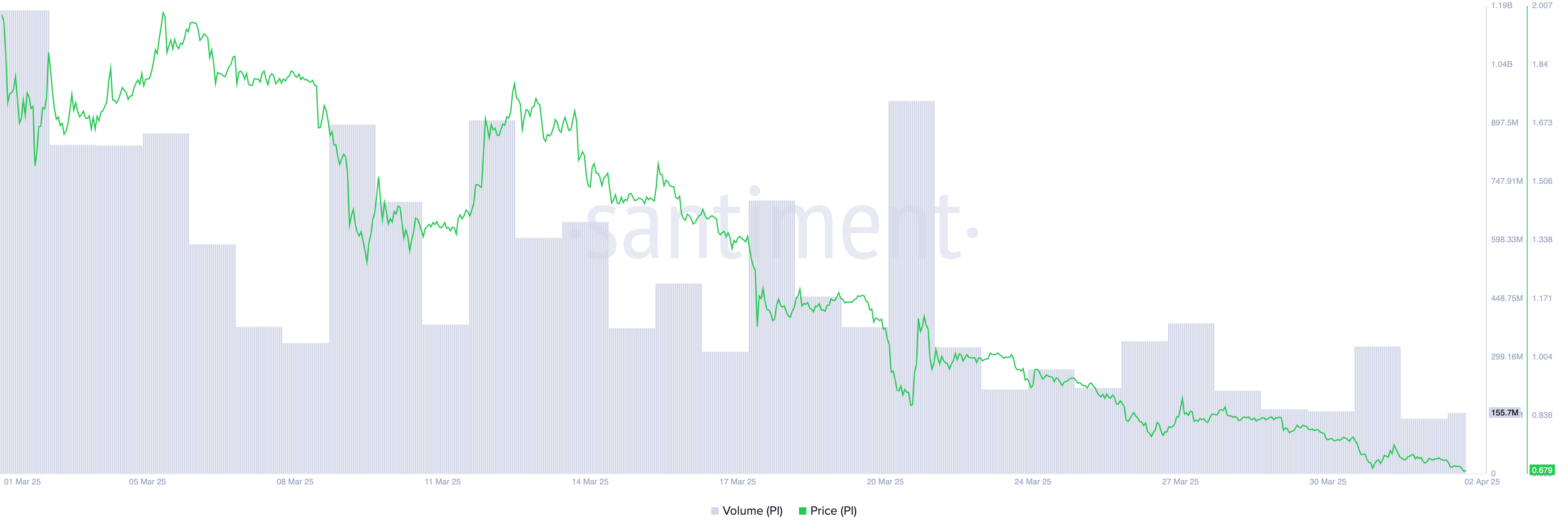 PI की गिरती दैनिक ट्रेडिंग वॉल्यूम Kan की स्थिति की पुष्टि करती है। आज तक, यह $156 मिलियन पर खड़ा है, जो 2 मार्च को दर्ज किए गए $1.38 बिलियन से 89% कम है।