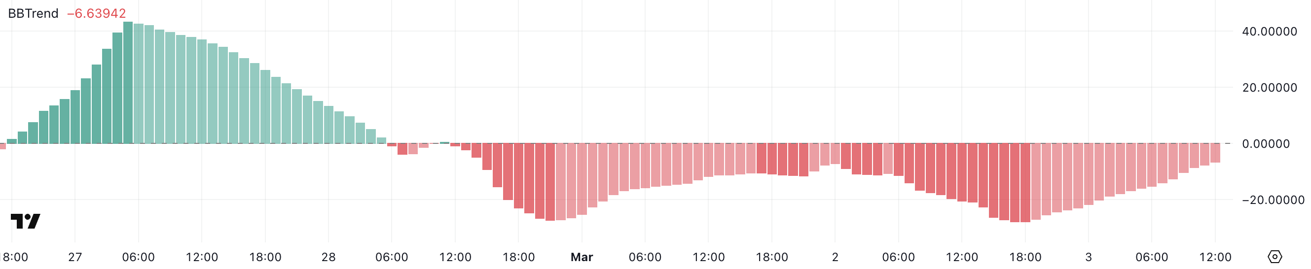 Pi Network एक लंबे समय से डाउनट्रेंड में है, जैसा कि इसके BBTrend इंडिकेटर द्वारा संकेतित है, जो 28 फरवरी से नकारात्मक बना हुआ है।