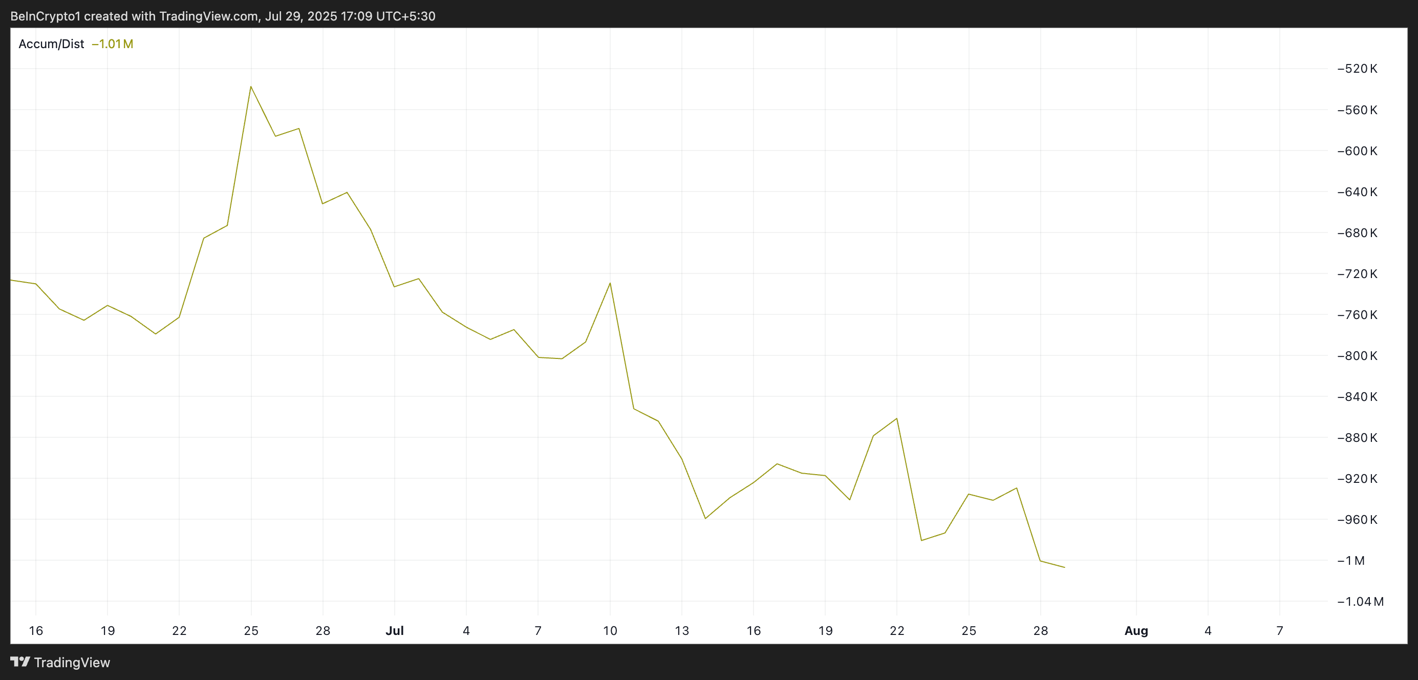 वर्तमान में -1.01 मिलियन पर, इसकी कीमत तब से 85% से अधिक गिर चुकी है, जो मार्केट प्रतिभागियों की घटती रुचि को दर्शाता है।