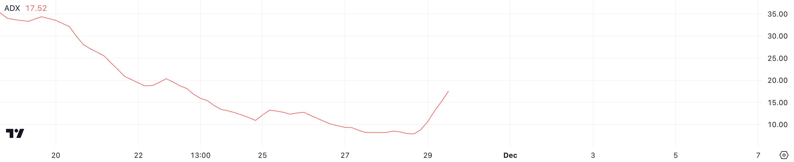PNUT की कीमत वर्तमान में एक अपट्रेंड में है, इसके ADX के 9 से नीचे से 17.5 तक चढ़ने के साथ, जो ट्रेंड की ताकत में सुधार का संकेत देता है। ADX, या एवरेज डायरेक्शनल इंडेक्स, 0 से 100 के पैमाने पर एक ट्रेंड की ताकत को मापता है, बिना इसके दिशा को इंगित किए।