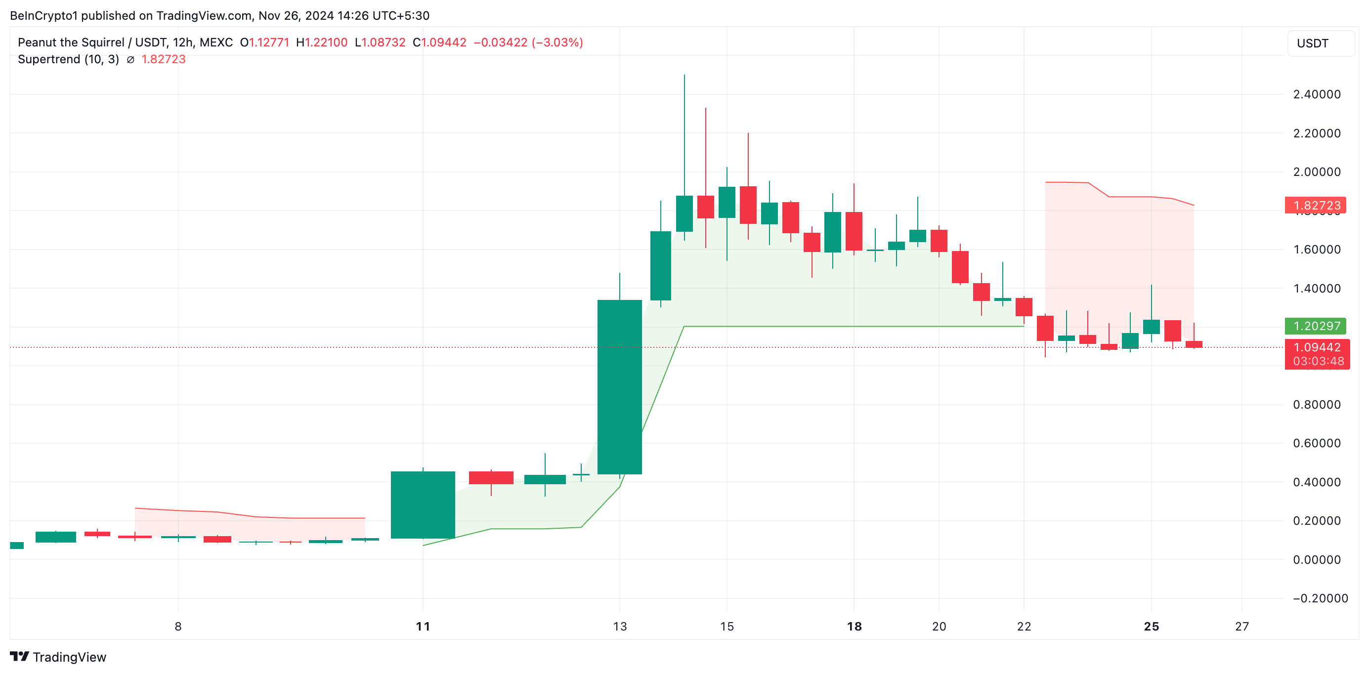 PNUT/USD 12-घंटे के चार्ट का मूल्यांकन मीम कॉइन की बिकवाली में वृद्धि की पुष्टि करता है। उदाहरण के लिए, इस लेखन के समय, PNUT की कीमत उसके सुपर ट्रेंड इंडिकेटर की लाल रेखा के नीचे है, जो एसेट की कीमतों में ट्रेंड की समग्र दिशा और ताकत की पहचान करता है।