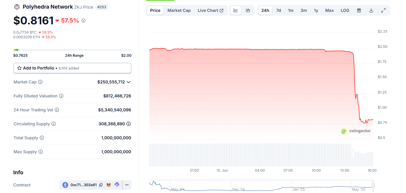Polyhedra Network के ZKJ टोकन ने 15 जून को एक घंटे से भी कम समय में लगभग 60% की गिरावट दर्ज की, जिससे $360 मिलियन से अधिक का मार्केट कैपिटलाइजेशन मिट गया।