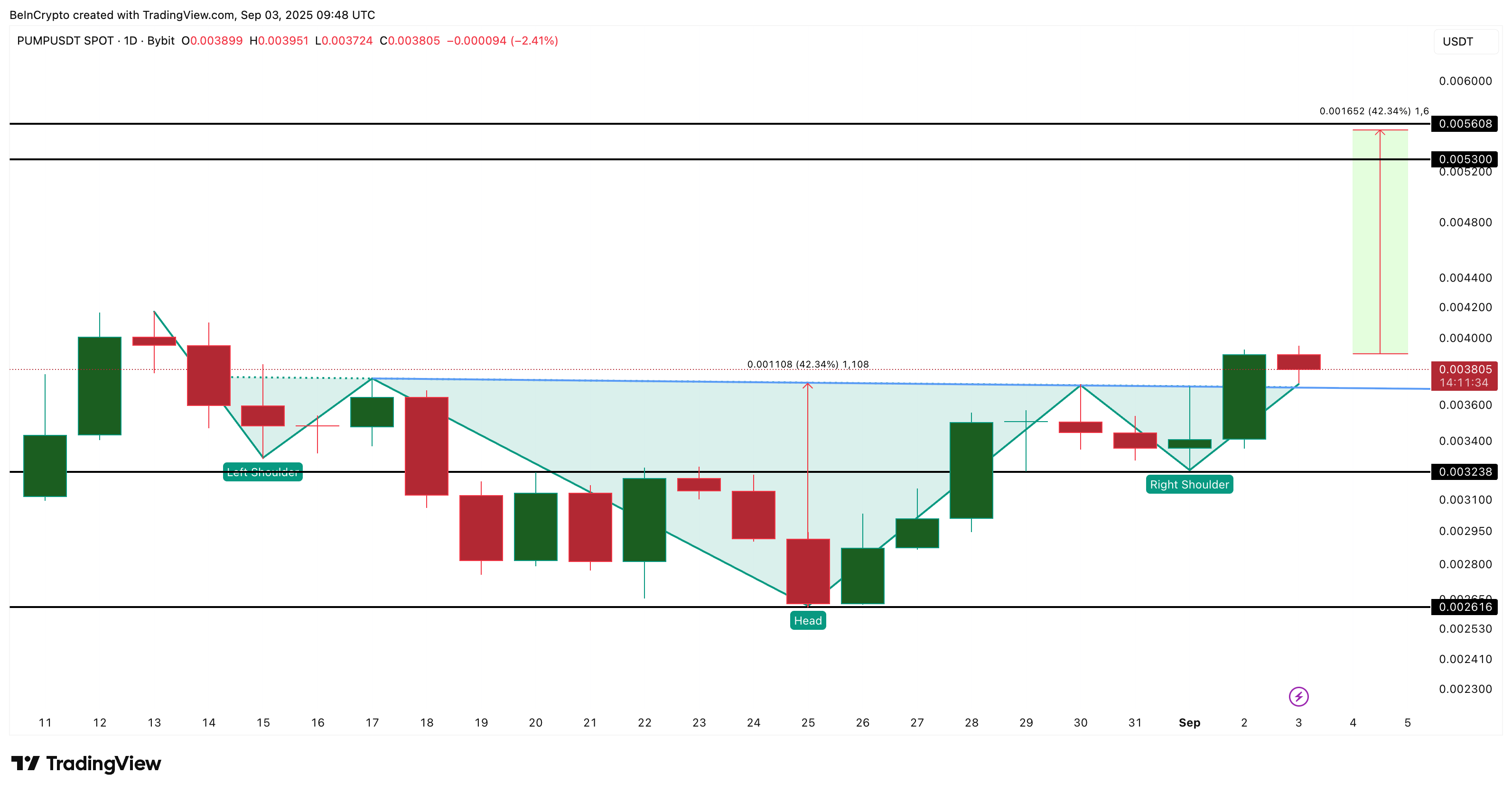 तकनीकी रूप से, PUMP प्राइस ने एक इनवर्स हेड एंड शोल्डर्स से ब्रेकआउट किया है, जो सबसे मजबूत बुलिश रिवर्सल सेटअप्स में से एक है। नेकलाइन ब्रेकआउट $0.0038 के पास आया, जिससे $0.0053 (40% मूव) का मापा गया लक्ष्य खुल गया। एक अधिक आक्रामक प्रोजेक्शन $0.0056 तक खिंचता है।