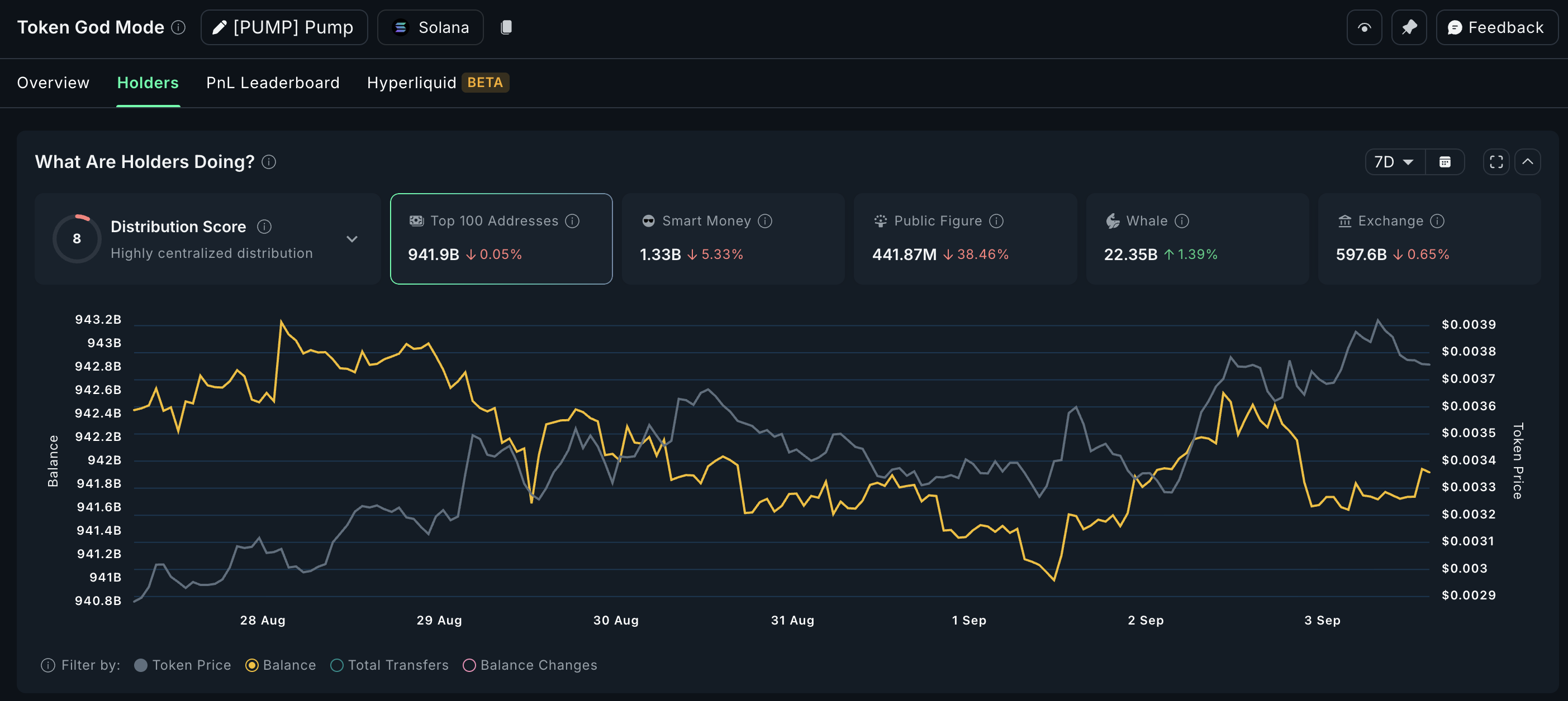 वर्तमान प्राइस $0.0038 पर, वॉलेट फ्लो विभिन्न ट्रेंड्स दिखा रहे हैं। शीर्ष 100 एड्रेस ने थोड़ी कटौती की, 47 मिलियन PUMP टोकन गिराए, जो लगभग $179,000 के बराबर है। स्मार्ट मनी बैलेंस 5.33% (लगभग 74 मिलियन टोकन, या $281,000) गिरा और पब्लिक-फिगर वॉलेट्स लगभग 38% (276 मिलियन टोकन, या $1.05 मिलियन) गिर गए।